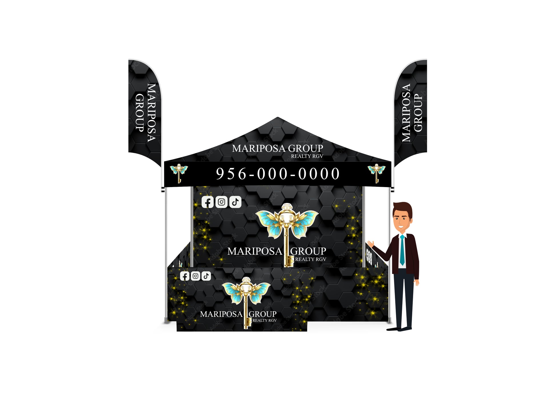 Custom Printed Tent With A Backdrop, 3 Half Walls, 2 Double Sided Flags And a Table Cover FREE DESIGN - 10x10 Custom Canopy For Marketing, Trade Shows, Festivals, Farmers Market and Any Event.