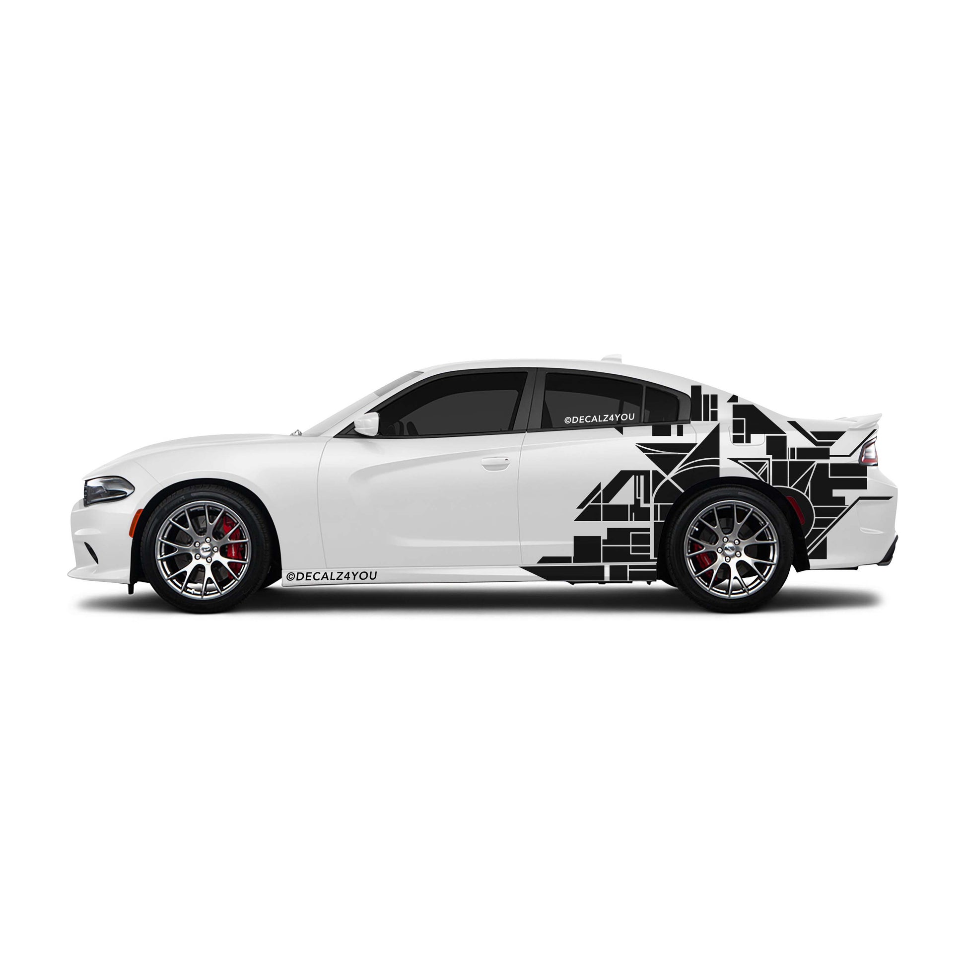 Elevate your Charger look with striking extra-large side graphics. This kit includes eye-catching decals for both the Driver and Passenger sides. (BOTH Sides Included) Elevate your vehicle's style and stand out on the road! It comes complete with application tape and easy-to-follow instructions, ensuring a flawless and hassle-free installation. Transform your ride with confidence!