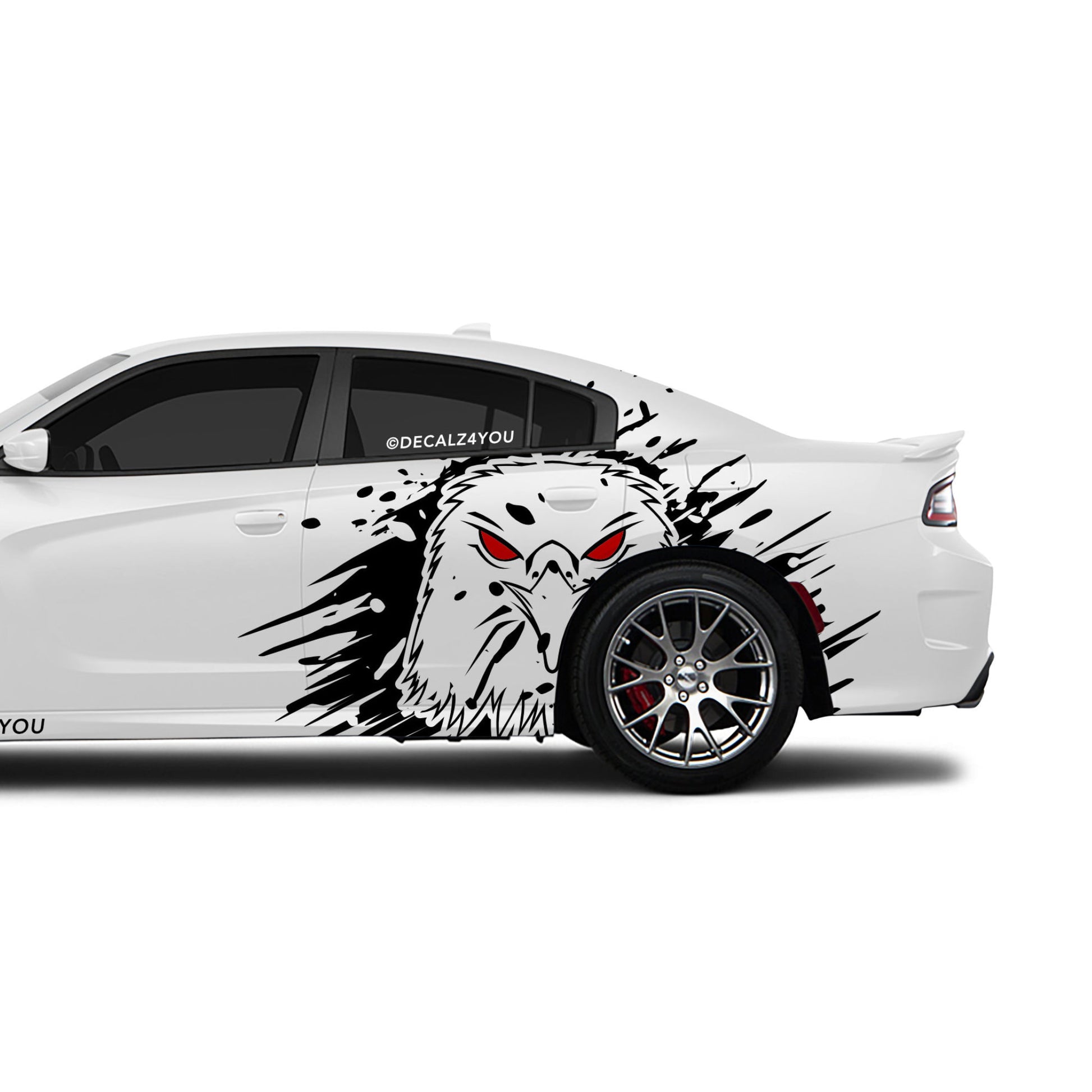 Elevate your Charger look with striking extra-large side graphics. This kit includes eye-catching decals for both the Driver and Passenger sides. (BOTH Sides Included) Elevate your vehicle's style and stand out on the road! It comes complete with application tape and easy-to-follow instructions, ensuring a flawless and hassle-free installation. Transform your ride with confidence!